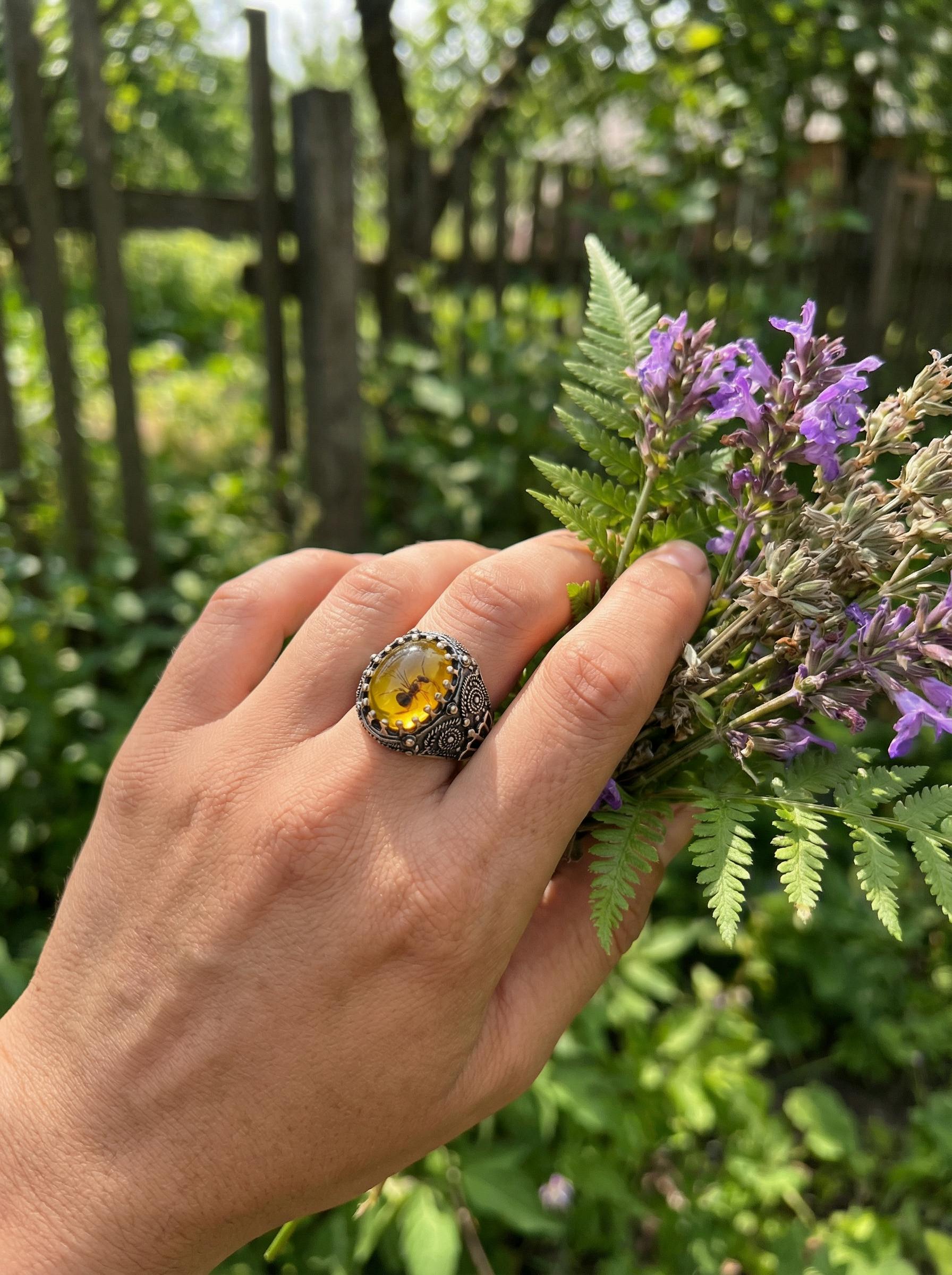 A luminous dome-shaped resin centerpiece mimics natural amber, glowing beautifully under daylight and sunset.
