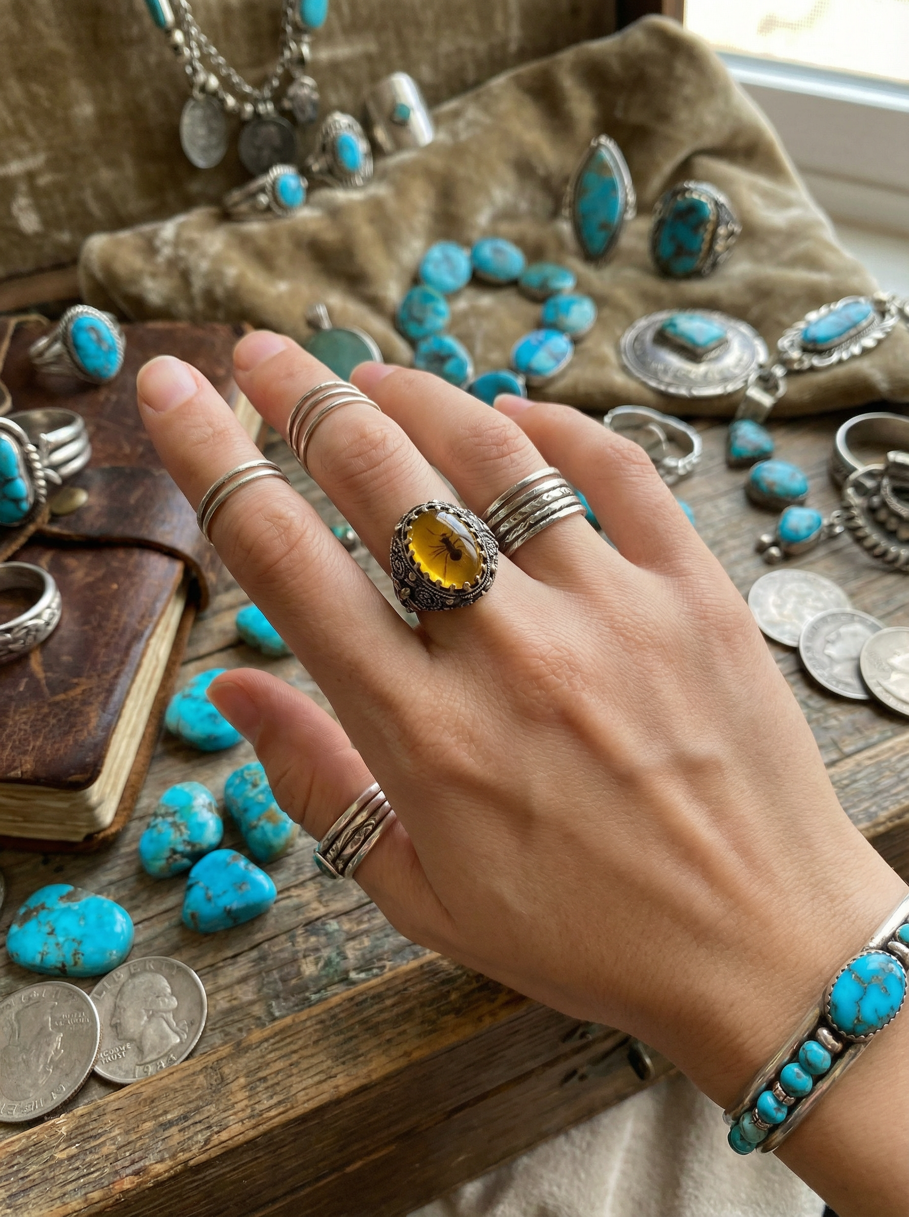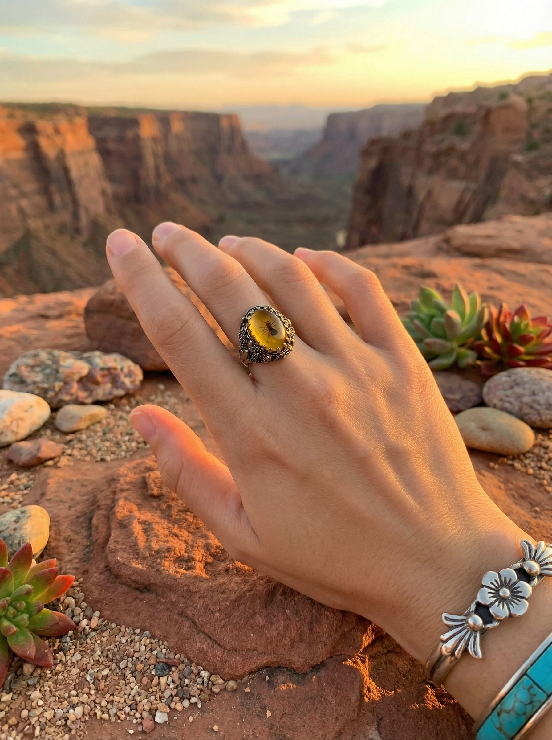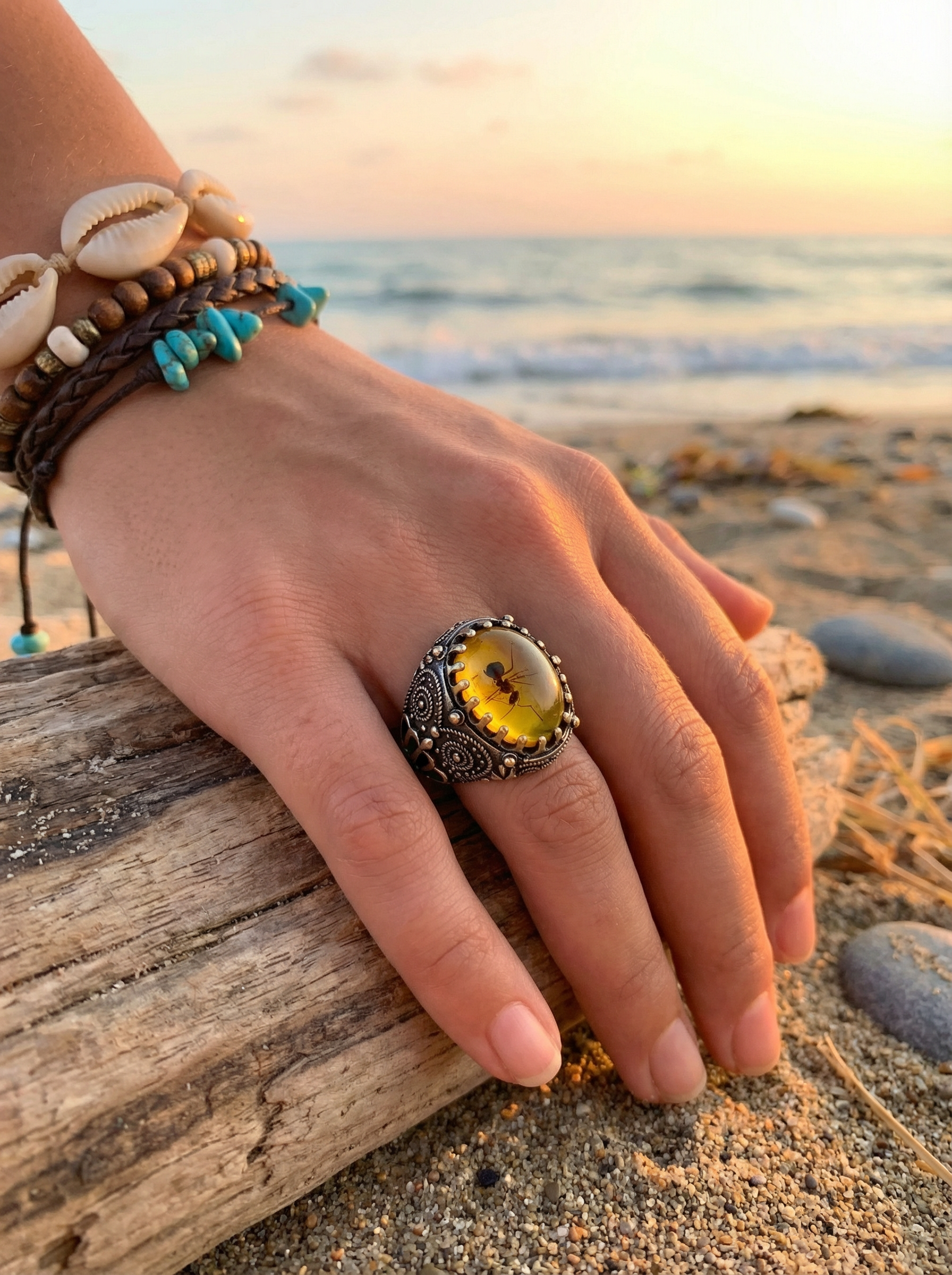 The designer, watching soft orange light stretch across the waves, noticed how the resin’s golden glow perfectly mirrored the sky. The small insect frozen inside felt like a message from nature — a reminder to pause, breathe, and honor the beauty of the moment.