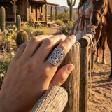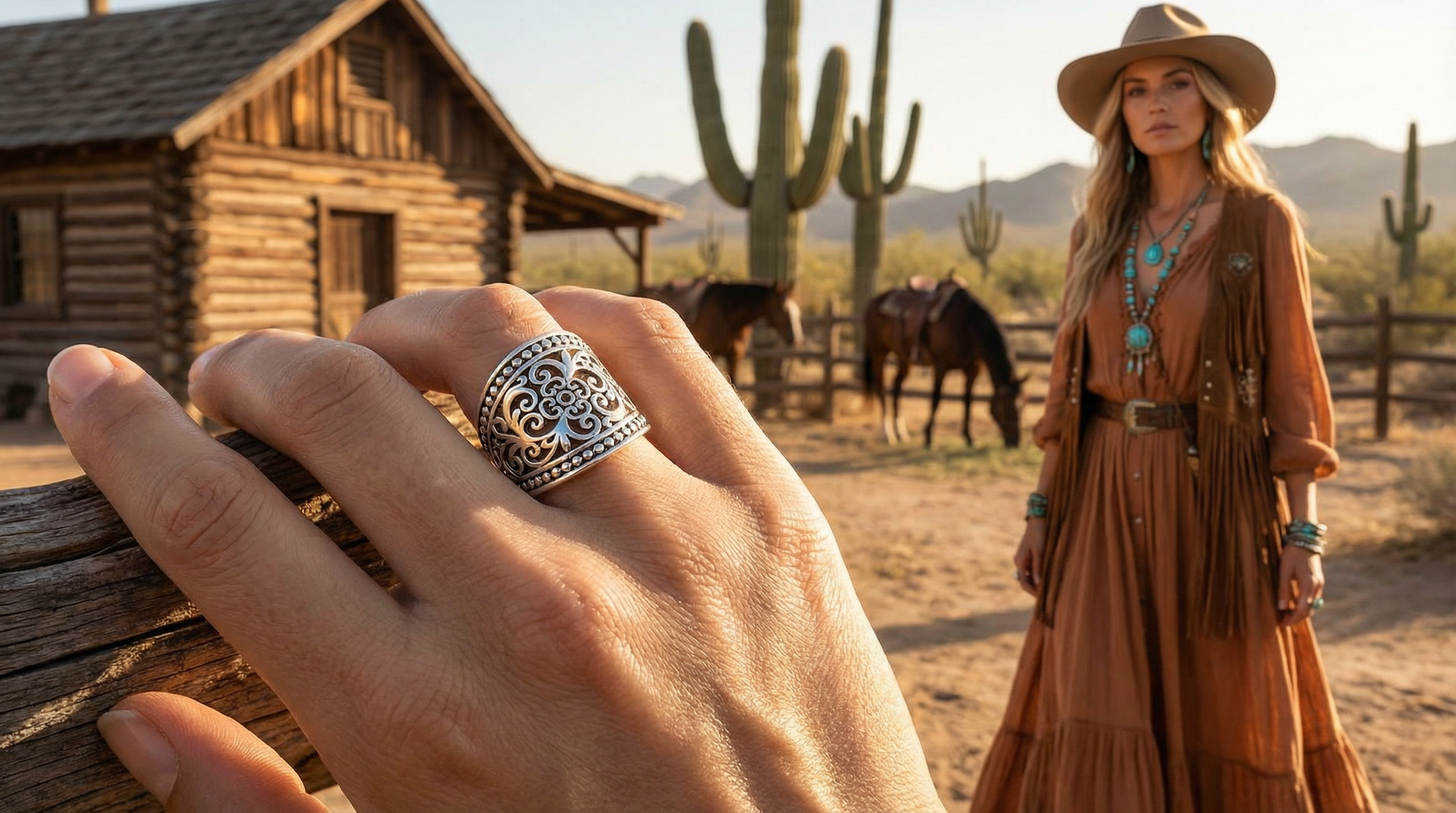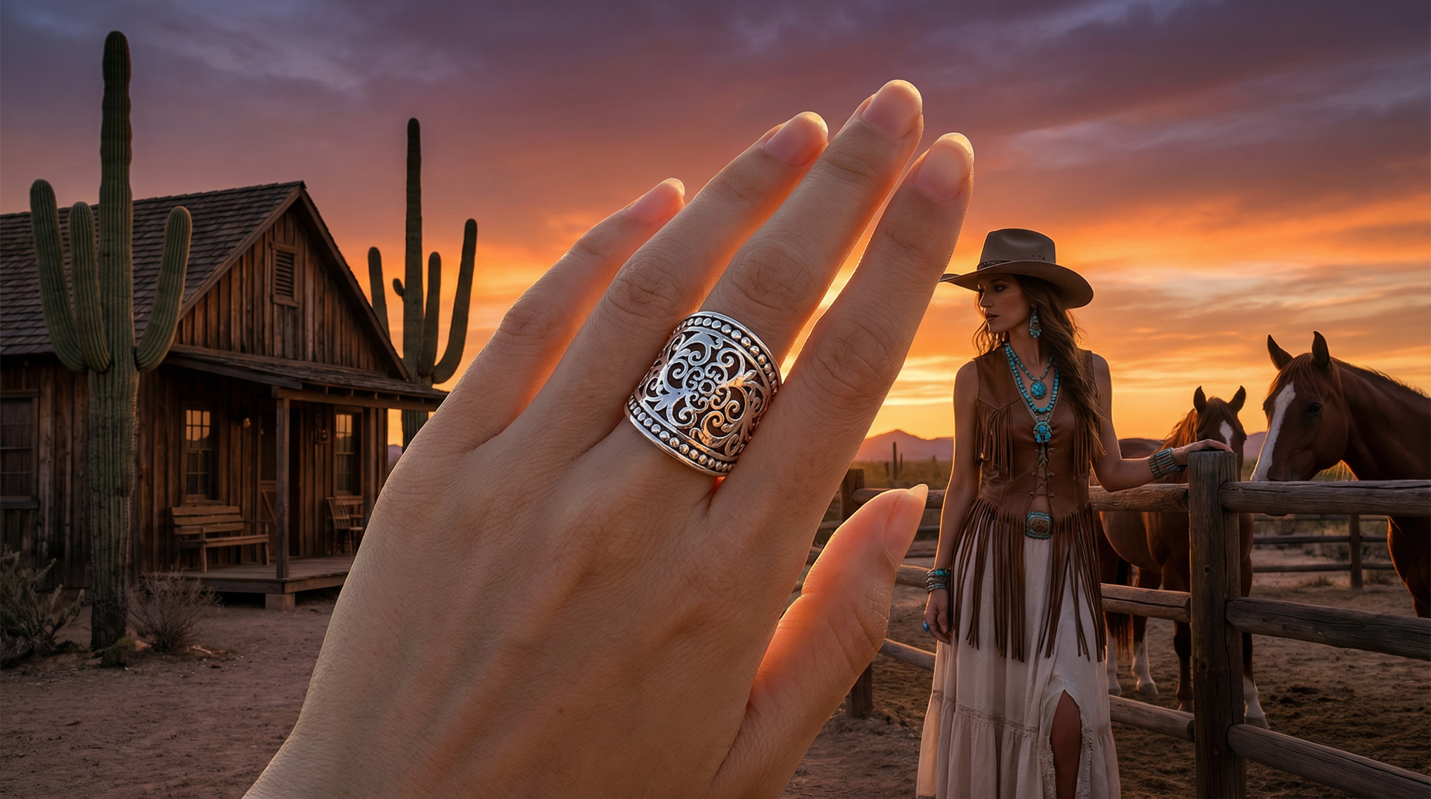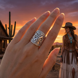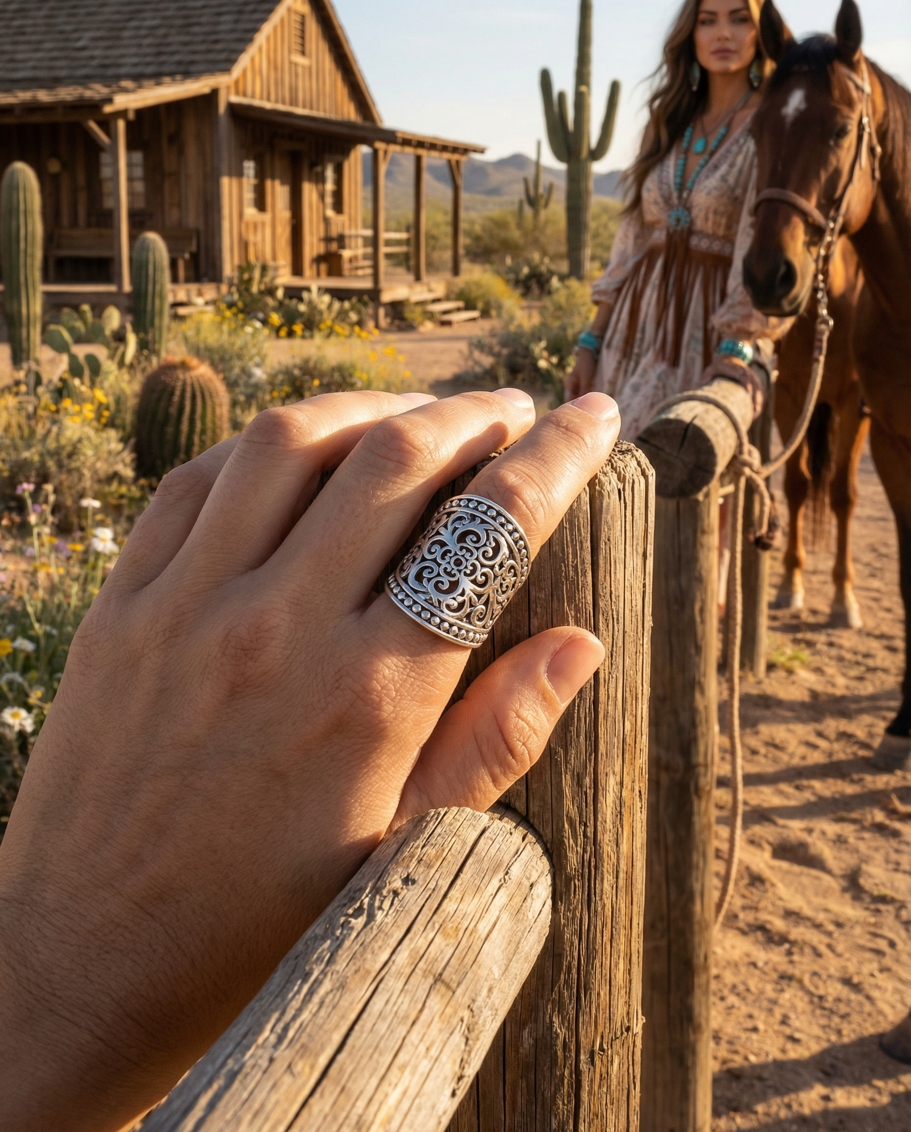 The wide design gives this ring a powerful yet elegant feel, allowing it to be worn alone as a statement ring or paired with other bohemian jewelry for a more complete Western look.