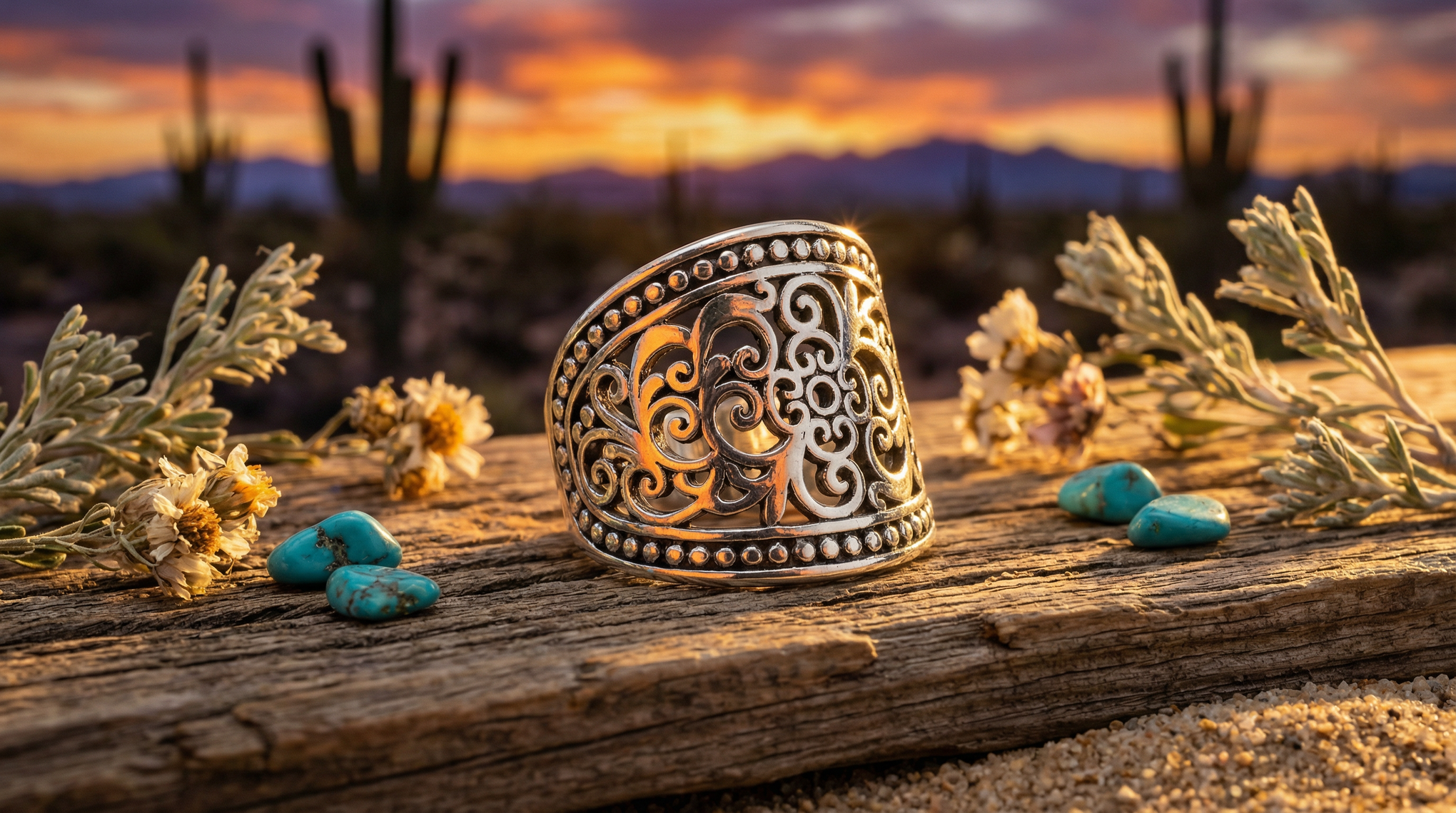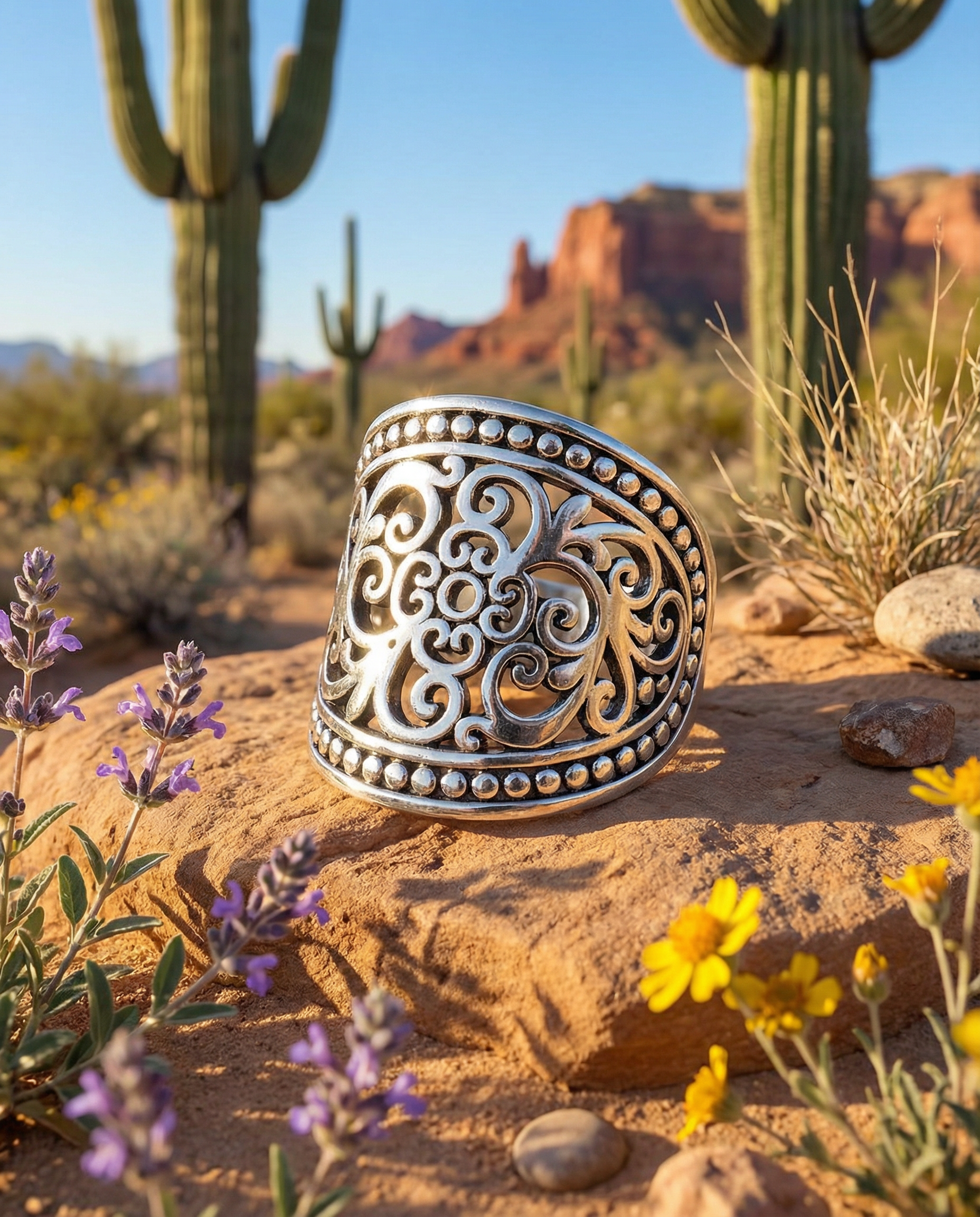 The ring face is crafted with a delicate filigree pattern, the design casting captivating light and shadow, reminiscent of the arc of a desert breeze rustling wildflowers.