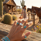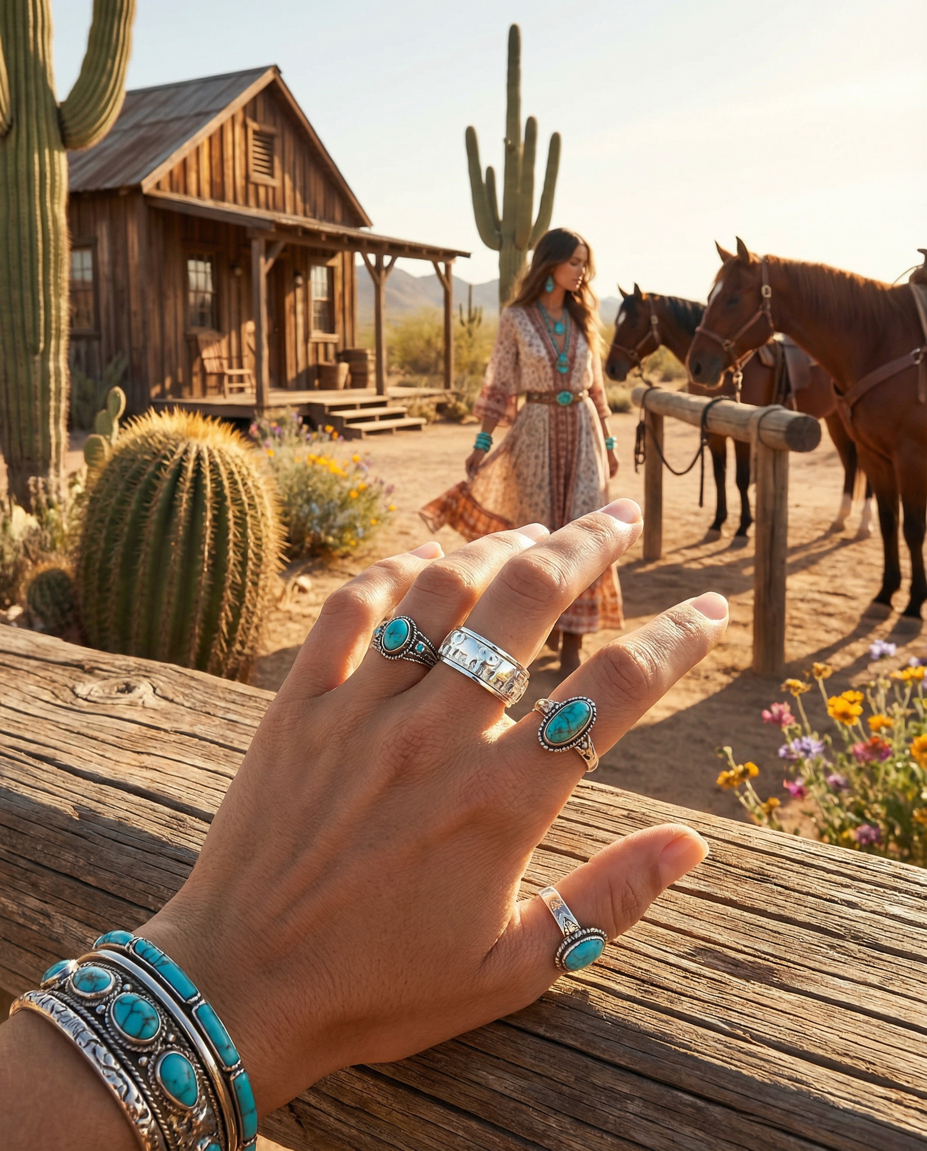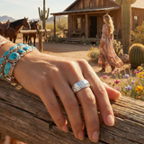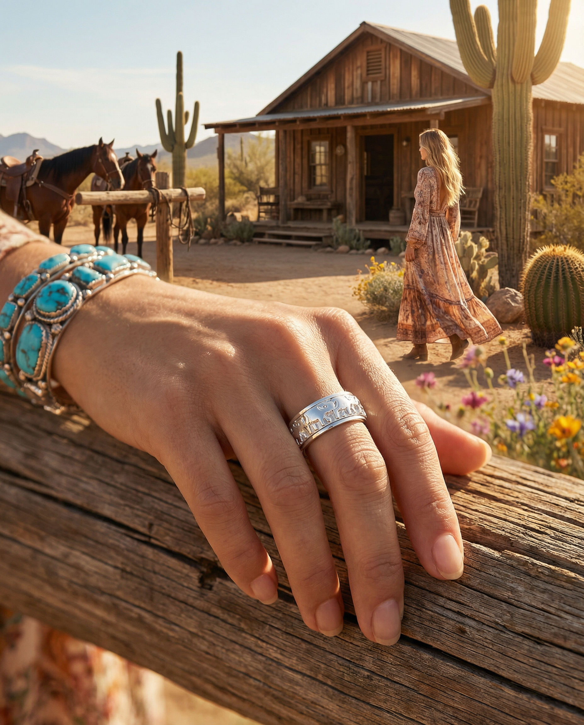 The wide design gives this ring a powerful yet elegant feel, allowing it to be worn alone as a statement ring or paired with other bohemian jewelry for a more complete Western look.