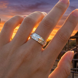 The ring face is crafted with a delicate filigree pattern, the design casting captivating light and shadow, reminiscent of the arc of a desert breeze rustling wildflowers.